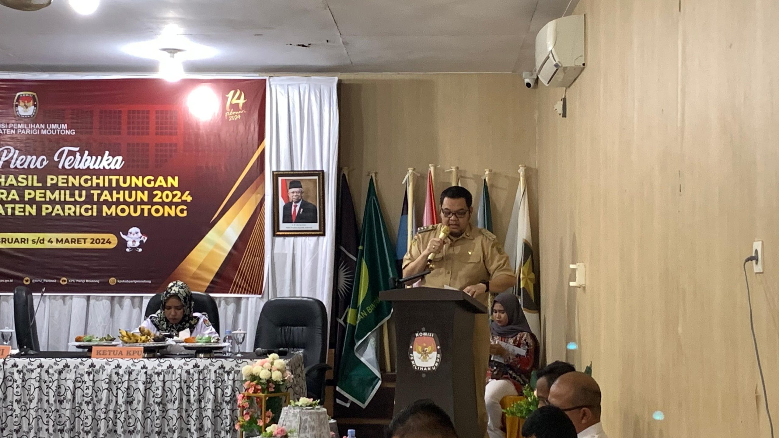 Bisalanews.id– Ricard Arnaldo Selaku Pj Bupati Parigi Moutong beri sambutan pada Rapat Pleno Rekapitulasi Perolehan Suara Pemilu Tingkat Kabupaten Parigi Moutong Tahun 2024 di aula Kantor KPU.(27/02/2024)
