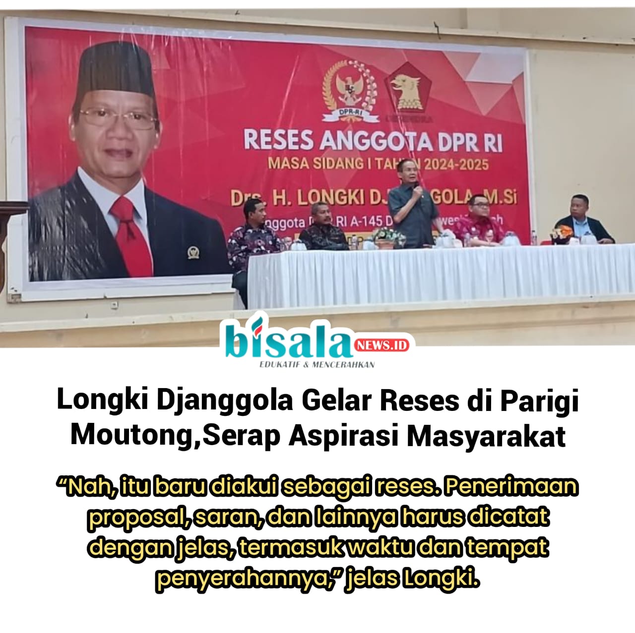 Bisalanews.id,Parmout, – Anggota Komisi II DPR RI, Longki Djanggola, menggelar reses di Kabupaten Parigi Moutong(Parmout), Sulawesi Tengah (Sulteng), pada Jumat (27/12/2024).
