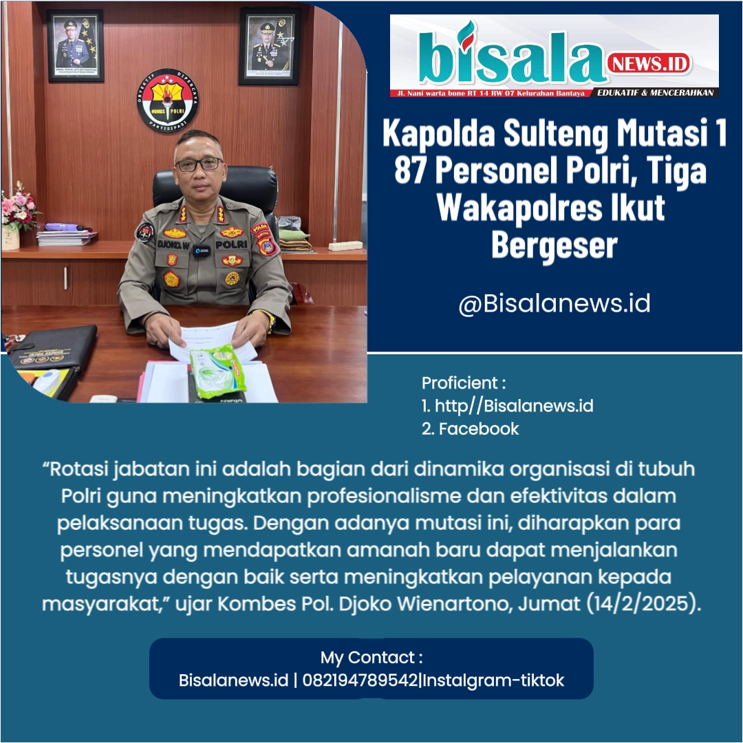 Bisalanews.id,Palu – Kapolda Sulawesi Tengah (Sulteng) Irjen Pol. Dr. Agus Nugroho, S.I.K., S.H., M.H melakukan mutasi jabatan terhadap 187 personel Polri yang terdiri dari Perwira Menengah (Pamen), Perwira Pertama (Pama), dan Bintara.