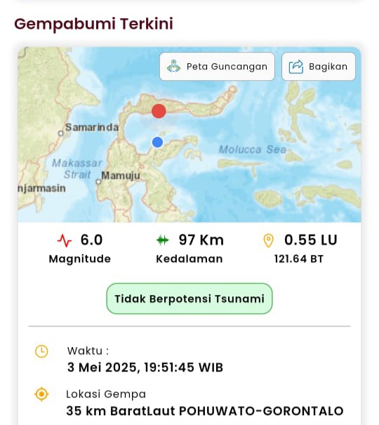 Bisalanews.id,Parmout – Guncangan gempa bumi berkekuatan magnitudo 6,0 yang mengguncang wilayah Pohuwato, Gorontalo, pada Sabtu malam (03/05/2025), turut dirasakan cukup jelas oleh warga di Kabupaten Parigi Moutong, Sulawesi Tengah.