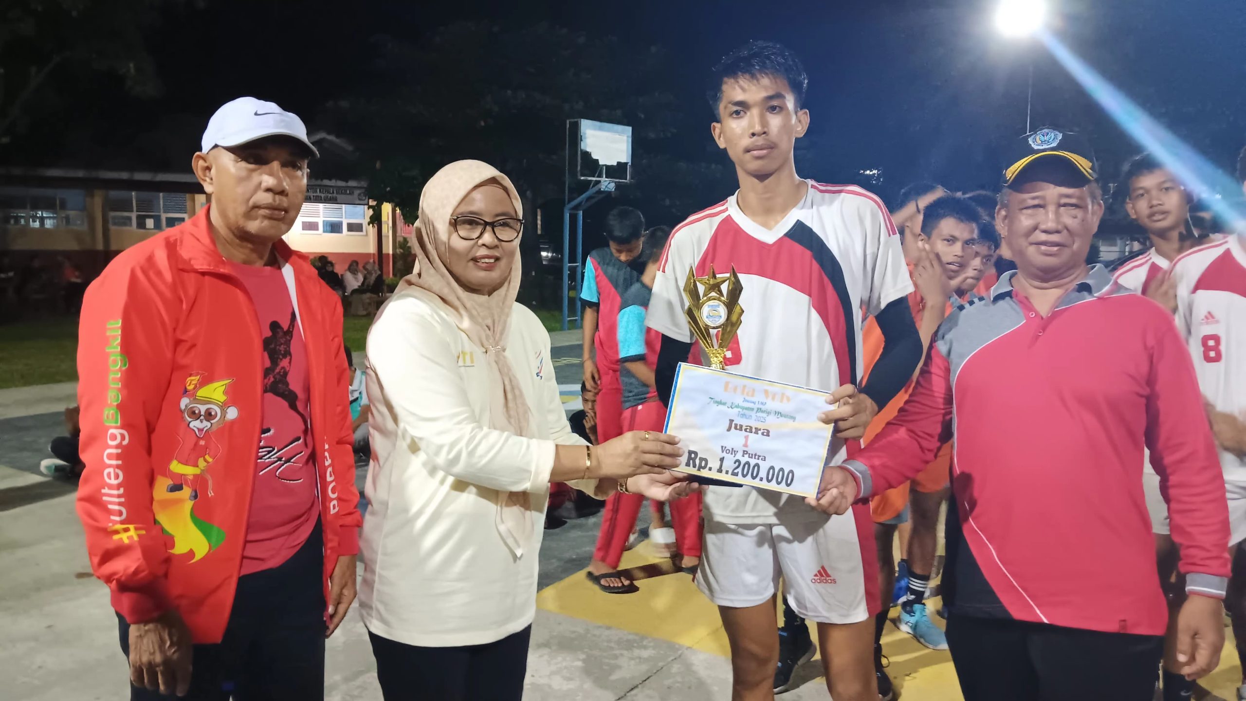 Ketua Persatuan Bola Voli Seluruh Indonesia (PBVSI) Kabupaten Parigi Moutong, Sunarti didampingi Sekretaris Umum KONI,Supardin dalam penyerahan Piala dan Bonus Juara satu ke Rayon SABATU 1 dilapangan voli ball SMP negeri 2 Parigi.(21/05/2025).Foto.MR