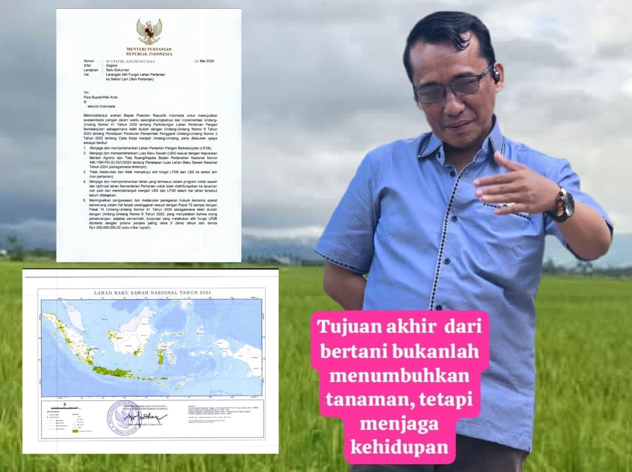 Penegasan tersebut merujuk pada surat dari Menteri Pertanian Republik Indonesia Nomor: B-193/SR.020/M/05/2025 tertanggal 16 Mei 2025, yang ditujukan kepada seluruh Gubernur, Bupati, dan Wali Kota se-Indonesia. Surat itu secara tegas melarang alih fungsi lahan pertanian produktif ke sektor non pertanian, termasuk pertambangan.