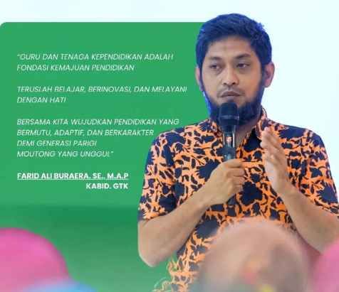 Bisalanews.id,Parmout — Kepala Bidang Guru dan Tenaga Kependidikan (GTK) Dinas Pendidikan dan Kebudayaan Kabupaten Parigi Moutong, Farid Ali Buraera, menegaskan pentingnya peran guru sebagai fondasi utama kemajuan pendidikan, khususnya dalam menjawab tantangan zaman yang terus berkembang.