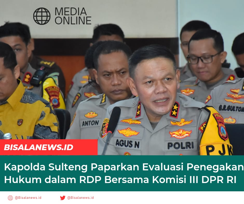 Bisalanews.id,Palu — Kapolda Sulawesi Tengah (Sulteng), Irjen Pol. Dr. Agus Nugroho, memaparkan capaian dan evaluasi penegakan hukum jajarannya dalam Rapat Dengar Pendapat (RDP) bersama Komisi III DPR RI yang berlangsung di Aula Rupatama Polda Sulteng, Jumat (25/07/2025).