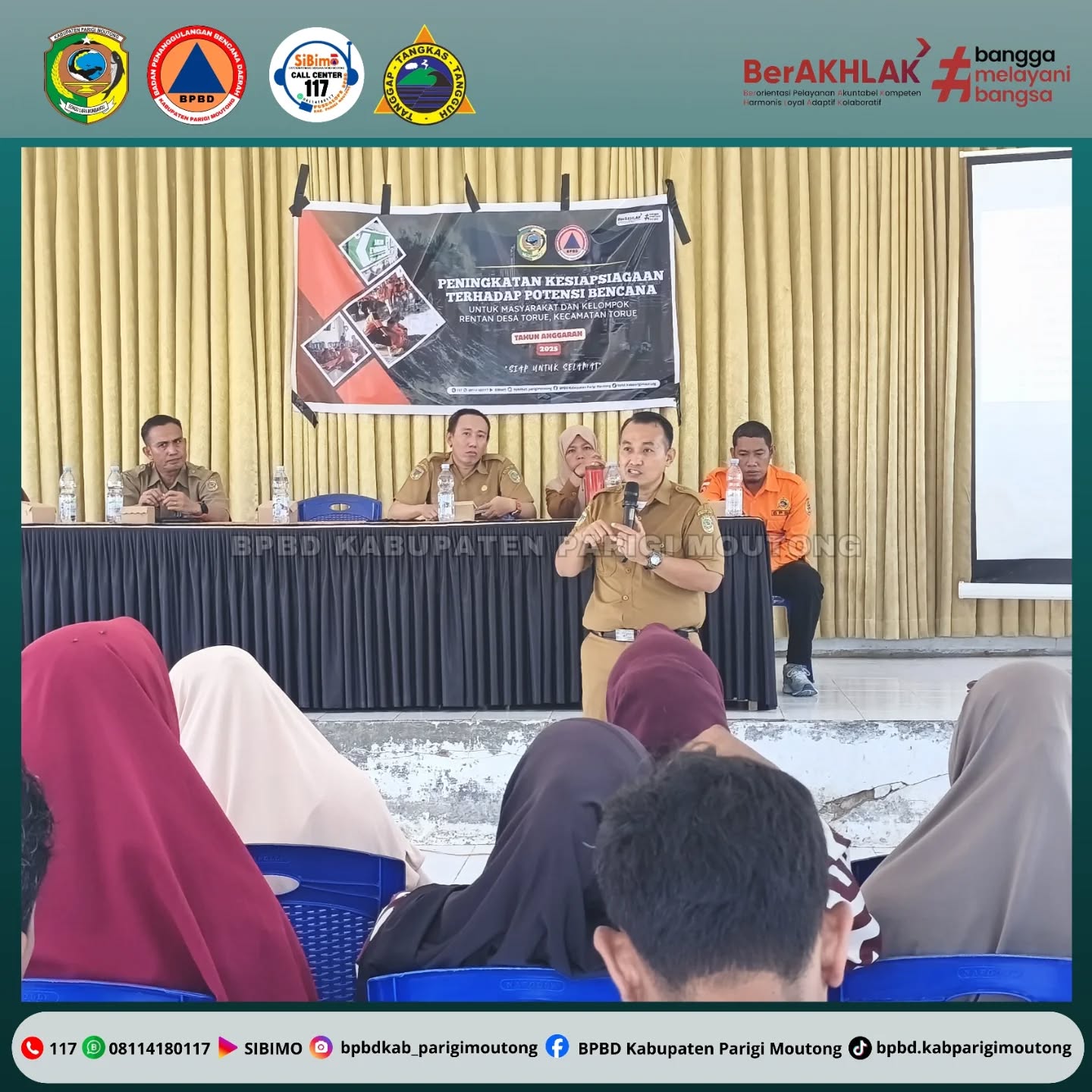 Kegiatan ini bertujuan memberikan pemahaman dasar mengenai ancaman gempa bumi dan tsunami di wilayah Torue, sekaligus mengajarkan langkah penyelamatan diri yang benar saat keadaan darurat. Para peserta dibekali materi mengenai peran dan fungsi BPBD dalam penanggulangan bencana di Kabupaten Parigi Moutong, serta penjelasan lengkap mengenai tahapan menghadapi bencana—mulai dari pra-bencana, saat bencana, hingga pascabencana—agar masyarakat mampu mengambil keputusan yang tepat pada setiap fase.