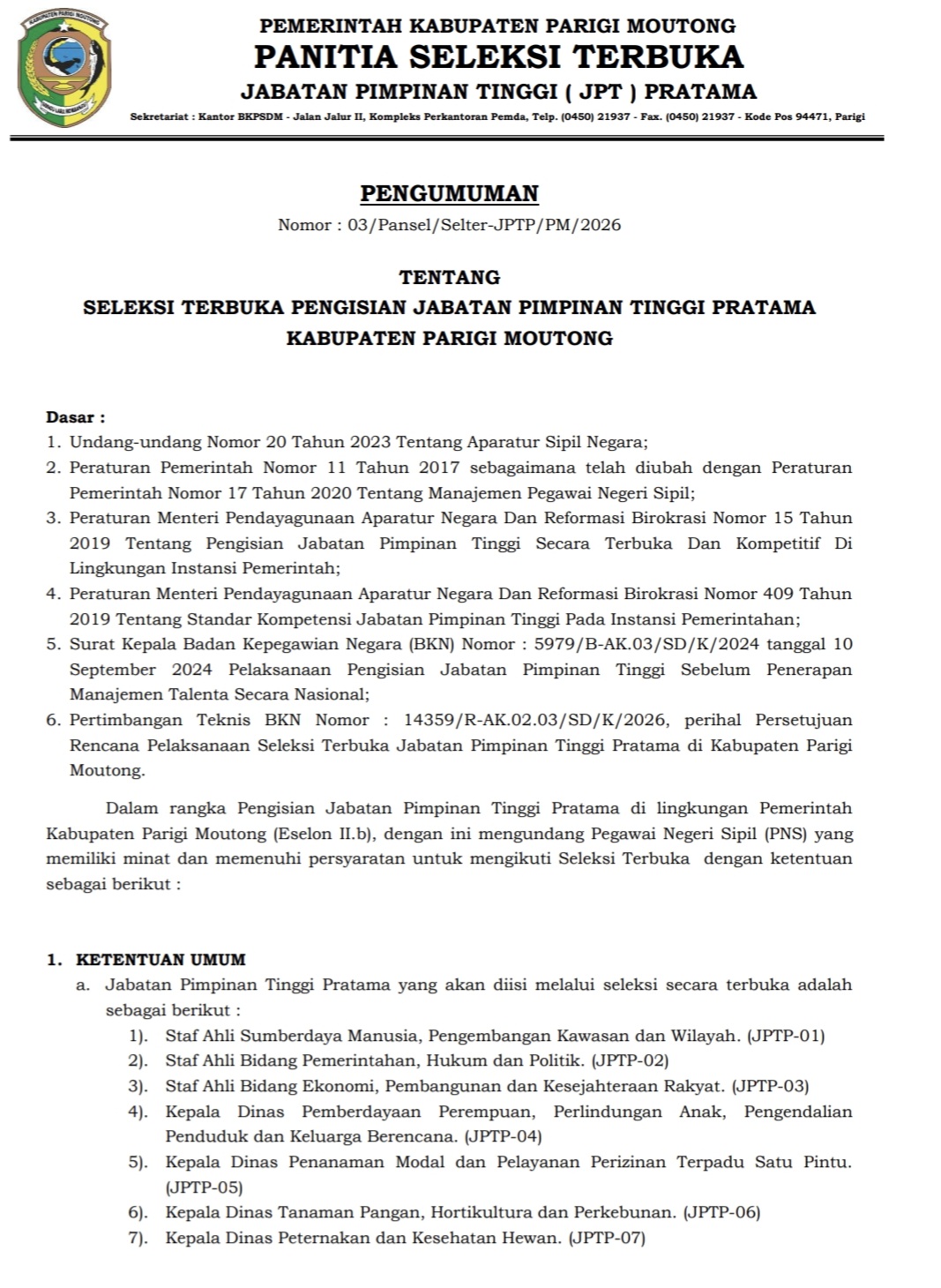 Bisalanews.id, Parmout – Pemerintah Kabupaten Parigi Moutong resmi membuka seleksi terbuka pengisian Jabatan Pimpinan Tinggi (JPT) Pratama tahun 2026.